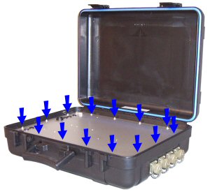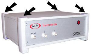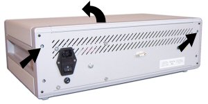 Gill AC - Slide the 4 purple corners towards the centre of the instrument, this will revile 4 screws, remove these screws and the 4 plastic corners, lift the lid gently upwards, disconnect the earth lead to the lid. When replacing the lid, remember the earth connection and do not over tighten the 4 corner screws, this will crack the plastic corners.