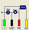 Another common occurrence is when the crocodile clip of WE2 has been held out of the way, by clipping it back to the wire of either of the three other leads. In this instance, the crocodile clip will cut through the insulation on the wire and short out WE2 with the other electrode lead.