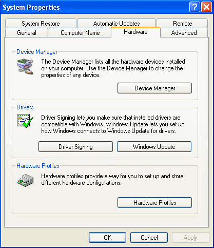 To launch the Device manager, right click on the “My Computer” icon (either on the Desktop or the Start menu) and select Properties, or press the Windows key and Break key.