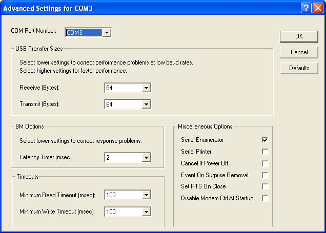 On the advanced page, change the Receive and Transmit USB transfer sizes to 64 (Bytes). Set the latency timer to 2 (msec). The Maximum Read and Write timeouts to 100 (msec).